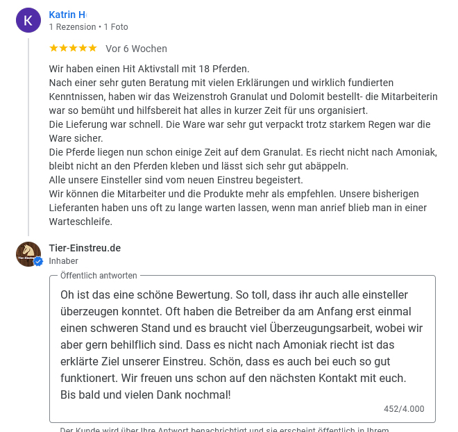 Tolle Bewertung: Super Einstreu und gut fürs Stallklima. Pellets bevorzugt.